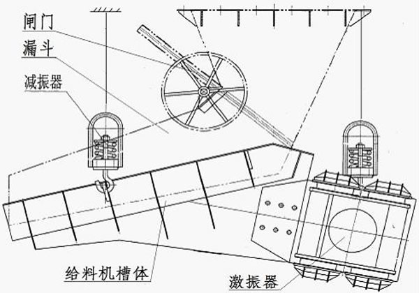 XZG振動放礦機通過懸吊裝置、安裝在料倉下部、通過相匹配的漏斗組成一個給料(放礦)系統(tǒng)、同時根據(jù)要求漏斗應配置閘門,便于調節(jié)物料流量及更換維修給料機時關閉料倉用。